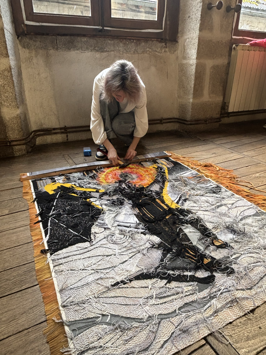Océane Masson Brage (Océane's Instagram), Aubusson's municipal weaver, created this new Aubusson tapestery in close conversation with Marc, after one of his drawings. The result is a vibrant and virtuose woven art piece.