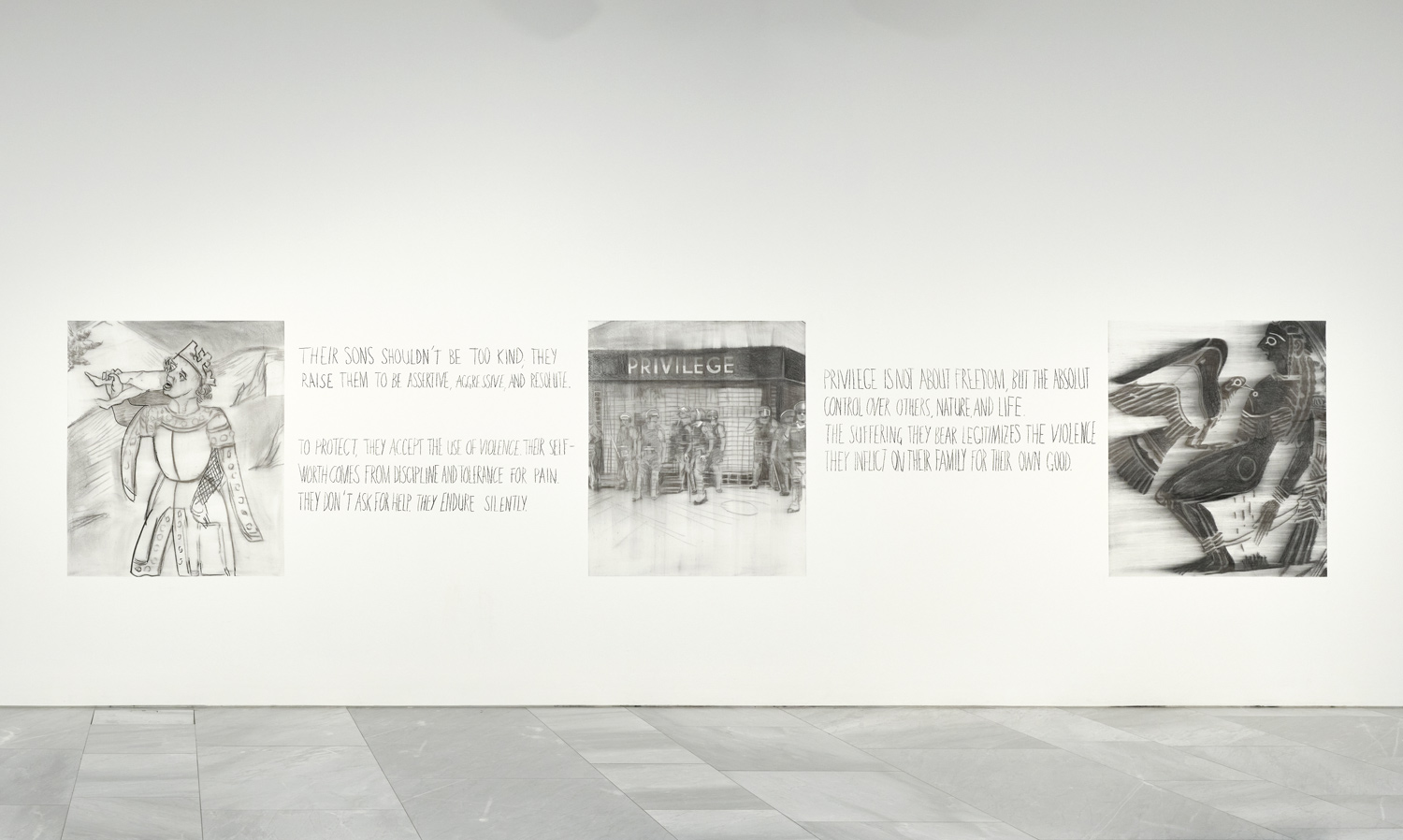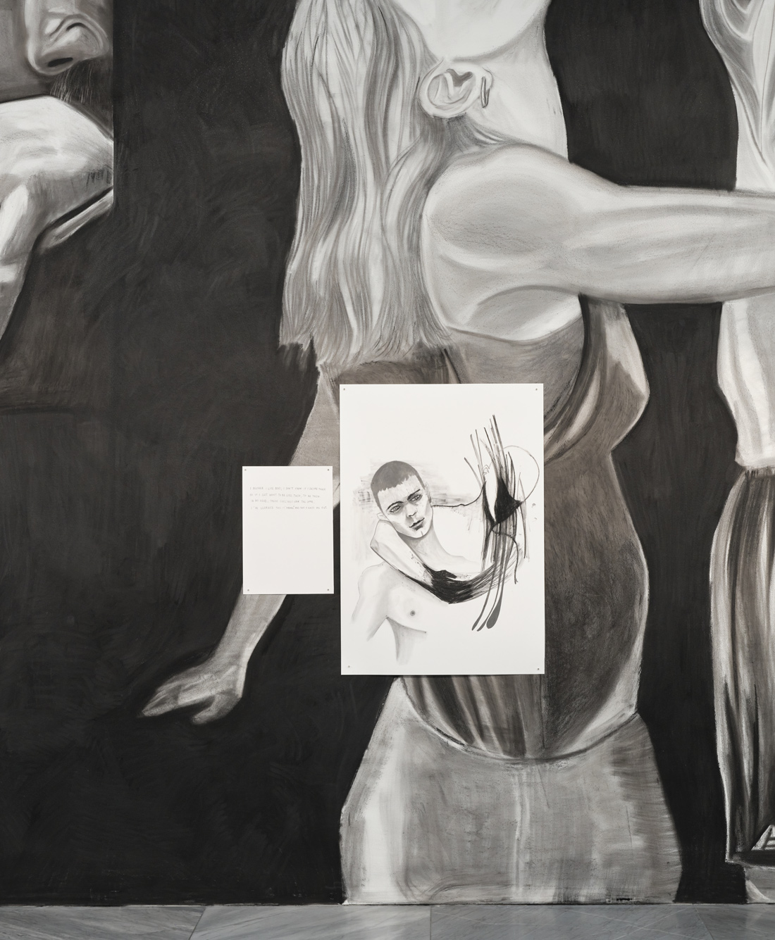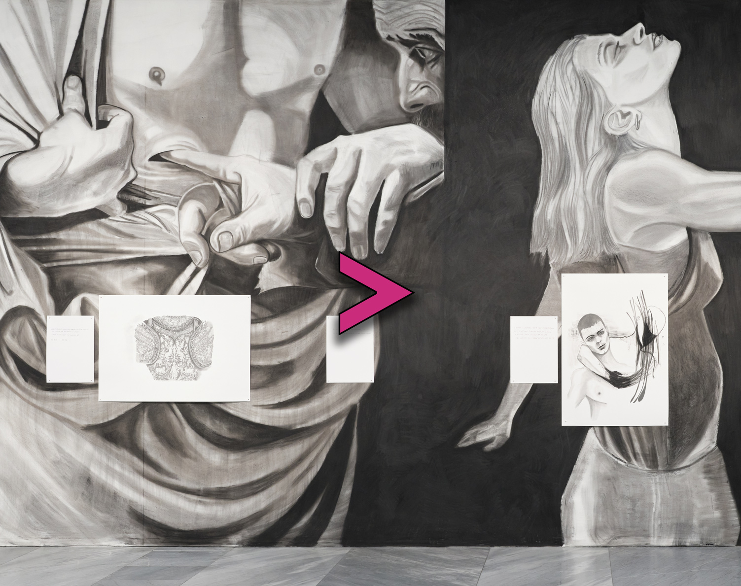 The exhibition starts with large scale wall drawings on which oil and charcoal drawings are installed and continues with works on paper and oil on canvas.