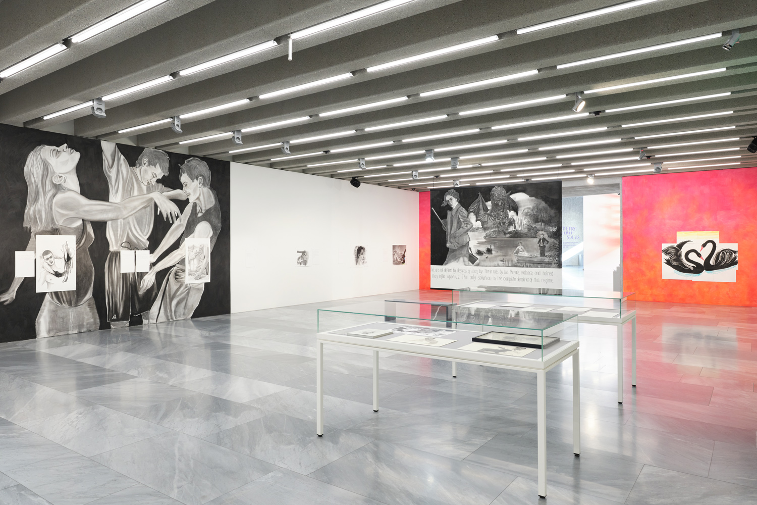 For The Blow-Up Regime Marc Bauer developed a multimedia concept for the first large exhibition hall of the Berlinische Galerie. The exhibition is an interplay of room-high, monumental wall drawings, supplemented by a soundtrack, drawings on paper pinned to the wall, and digitised drawings on e-paper displays distributed throughout the room.