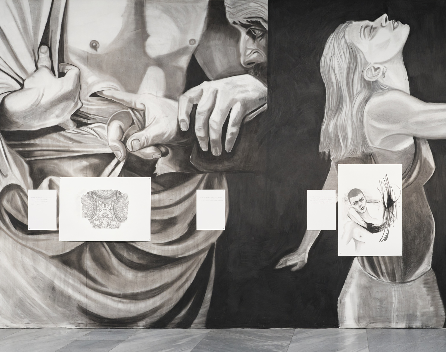 The exhibition starts with large scale wall drawings on which oil and charcoal drawings are installed and continues with works on paper and oil on canvas.
