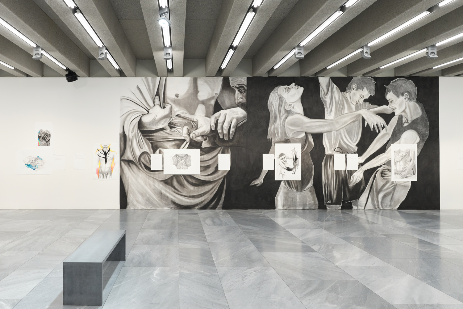 For The Blow-Up Regime Marc Bauer developed a multimedia concept for the first large exhibition hall of the Berlinische Galerie. The exhibition is an interplay of room-high, monumental wall drawings, supplemented by a soundtrack, drawings on paper pinned to the wall, and digitised drawings on e-paper displays distributed throughout the room.